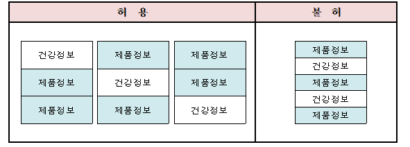 - 그간 건강정보는 제품정보와 연결되지 않도록 한 곳에 모아 맨 뒤로 배열 시켜 구획을 나누어 광고토록 하고 있으나, 광고의 시대적 상황에 맞게 가이드 변경 및 매체별 가이드 세분화