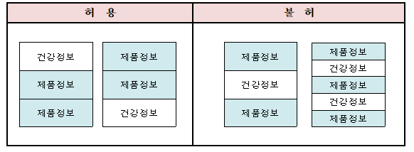 ① 인쇄물, 인터넷 매체 : 건강정보의 구획을 명확히(구분선 또는 배경색) 구분하며, 건강정보의 상단과 하단에 제품과 관련없는 정보임을 명확히 명시토록 하며, 광고물 내 건강정보의 위치는 자유롭게 위치하도록 함. 다만, 건강정보와 제품정보가 혼재될 경우 소비자가 건강정보를 제품정보로 오인·혼동할 우려가 있으므로 기존과 동일하게 허용 불가